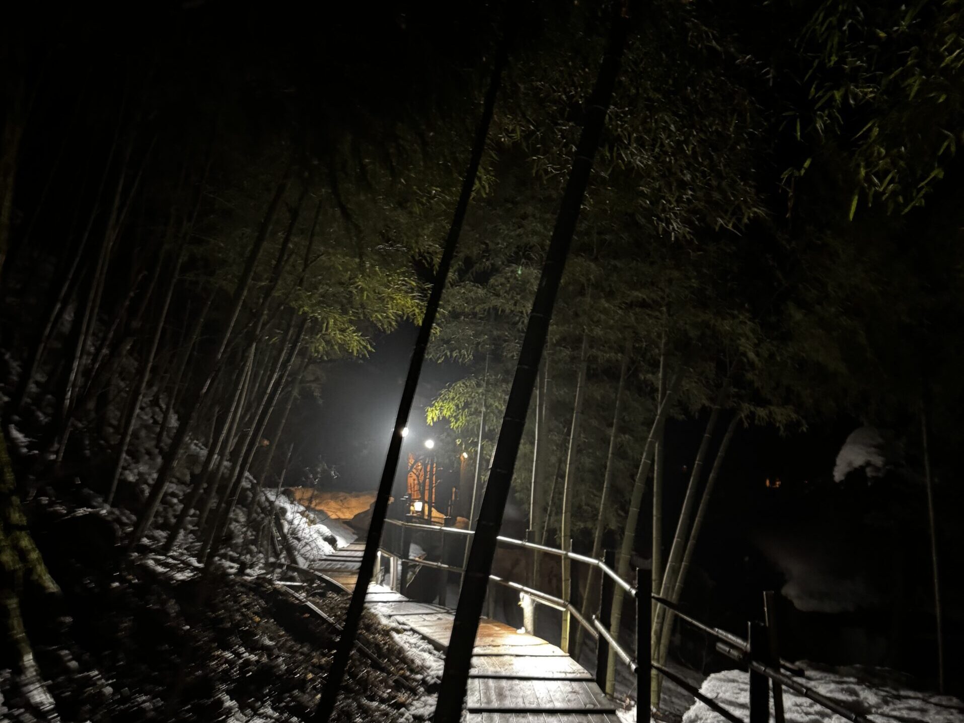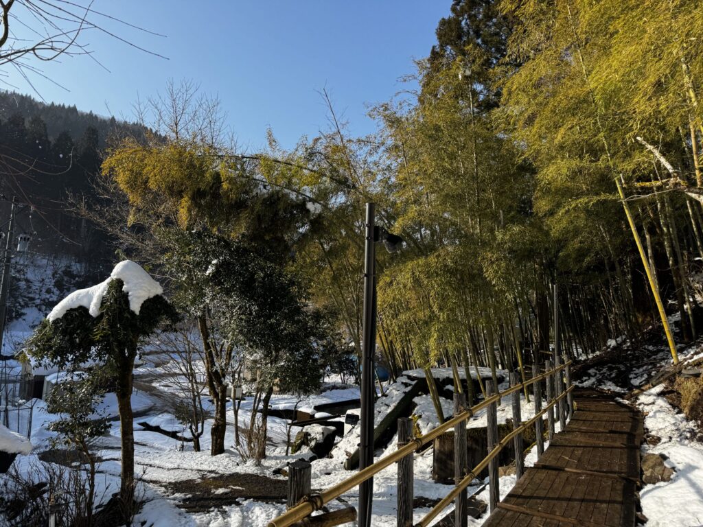 雪景色の中、渡り廊下を抜けてお風呂へ向かう途中――